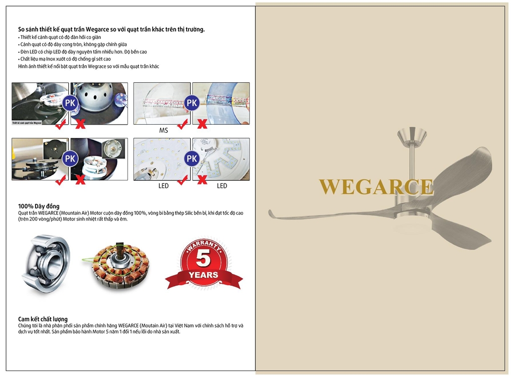 - Quạt trần đèn WEGARCE gồm có AC&DC sử dụng động cơ có loãi thếp Silic cao cấp và dây quấn bằng đồng 100%. Dòng động cơ này giúp cho các sản phẩm của WEGARCE tiết kiệm năng lượng từ 40-80% so với những sản phẩm khác cùng loại trên thị trường.