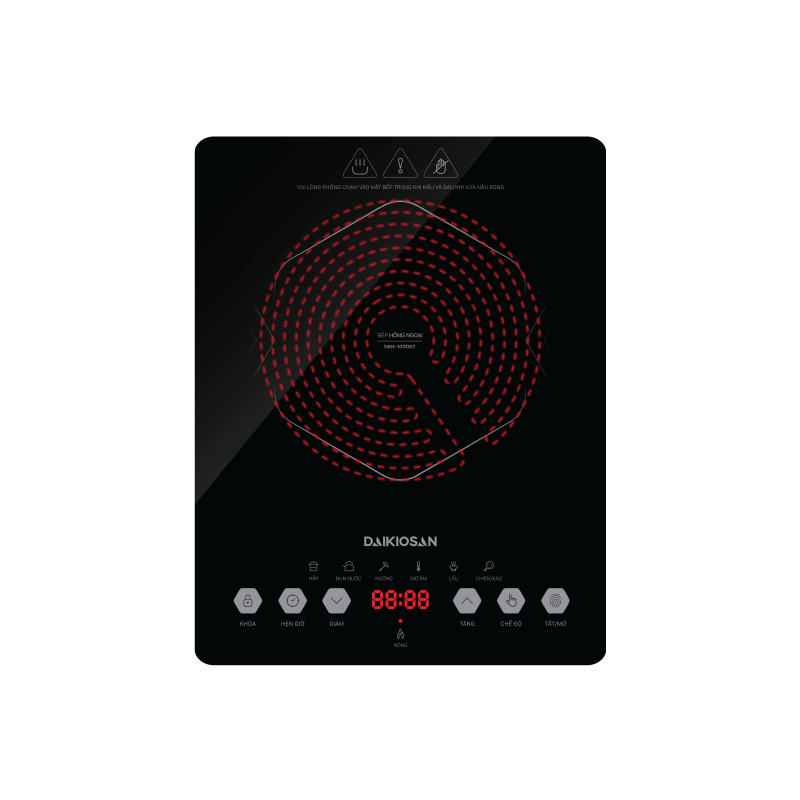 Khóa an toàn trẻ emCó bảo vệ chênh lệch điện áp, cảnh báo nhiệt dư hoặc quá nhiệtTự động tắt bếp khi mặt kính đạt nhiệt độ quá cao, tự động khôi phục |