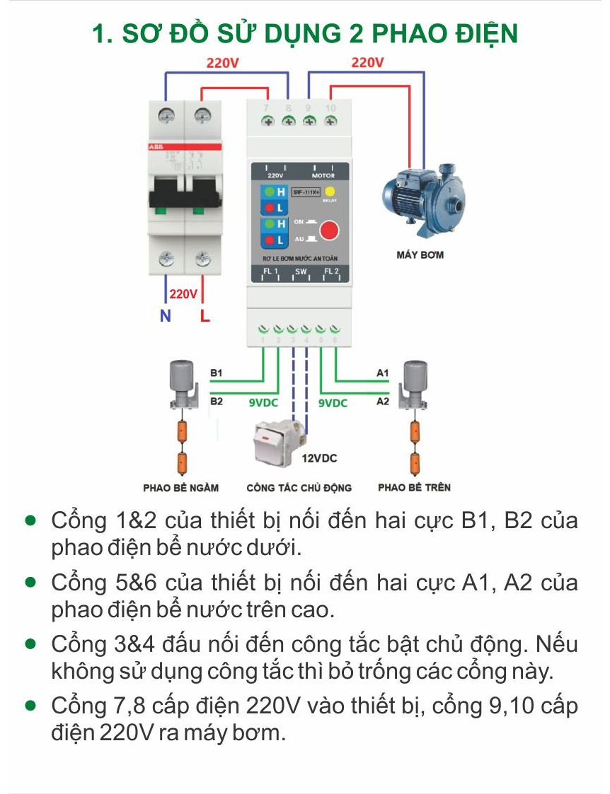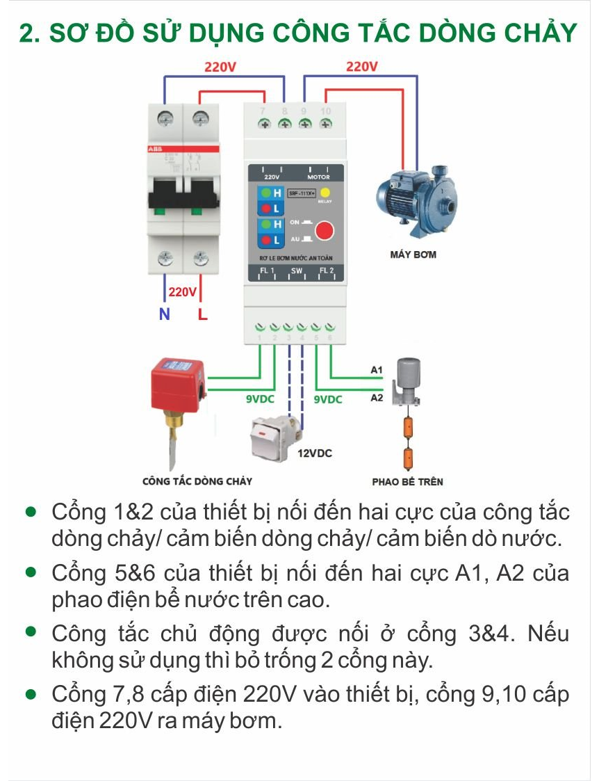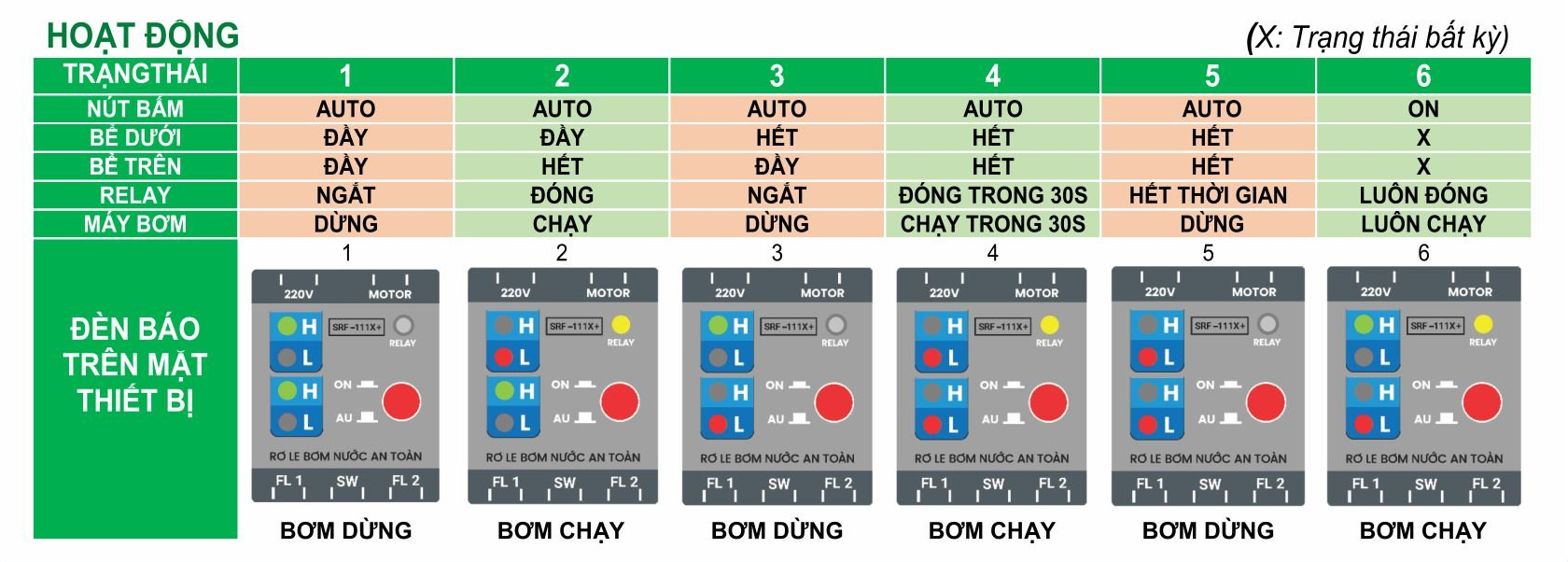Khi mức nước ở bể trên giảm xuống đến ngưỡng L (đèn đỏ sáng), thiết bị sẽ khởi động máy bơm và kiểm tra nguồn nước cấp vào máy bơm thông qua trạng thái của một trong số các loại thành phần gắn thêm như: phao điện hoặc cảm biến dòng chảy/cảm biến dò nước.. trong ~ 30 giây. Sau 30 giây nếu đủ nước cấp vào máy bơm sẽ bơm đến khi bể chứa trên đầy đến mức H (đèn xanh sáng), nếu không đủ nước cấp vào máy bơm, thiết bị sẽ ngắt điện để bảo vệ máy bơm.
