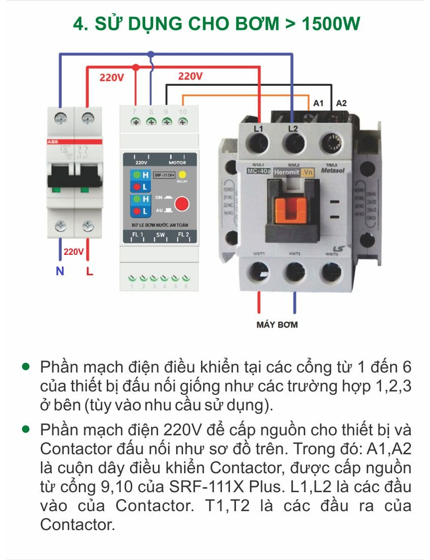 SRF-111X Plus có thể sử dụng với phao điện hoặc công tắc dòng chảy/ cảm biến dòng chảy/ cảm biến dò nước… để điều khiển tự động và bảo vệ an toàn cho máy bơm nước và người sử dụng.SRF-111X Plus trang bị các đèn báo mức nước ở cả hai bể chứa dưới và trên, giúp theo dõi mức nước trực quan hơn trong quá trình sử dụng hay sửa chữa hệ thống bơm nước.