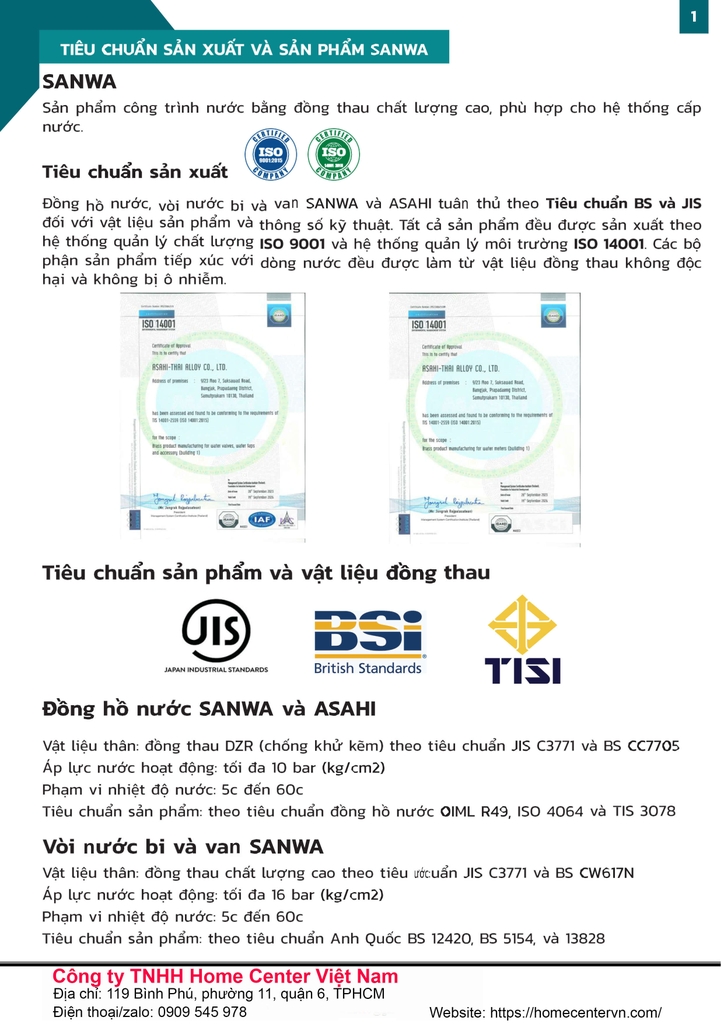 Đồng hồ nước, vòi nước bi và van SANWA và ASAHI tuân thủ theo Tiêu chuẩn BS và JIS đối với vật liệu sản phẩm và thông số kỹ thuật. Tất cả sản phẩm đều được sản xuất theo hệ thống quản lý chất lượng ISO 9001 và hệ thống quản lý môi trường ISO 14001. Các bộ phận sản phẩm tiếp xúc với dòng nước đều được làm từ vật liệu đồng thau không độc hại và không bị ô nhiễm.