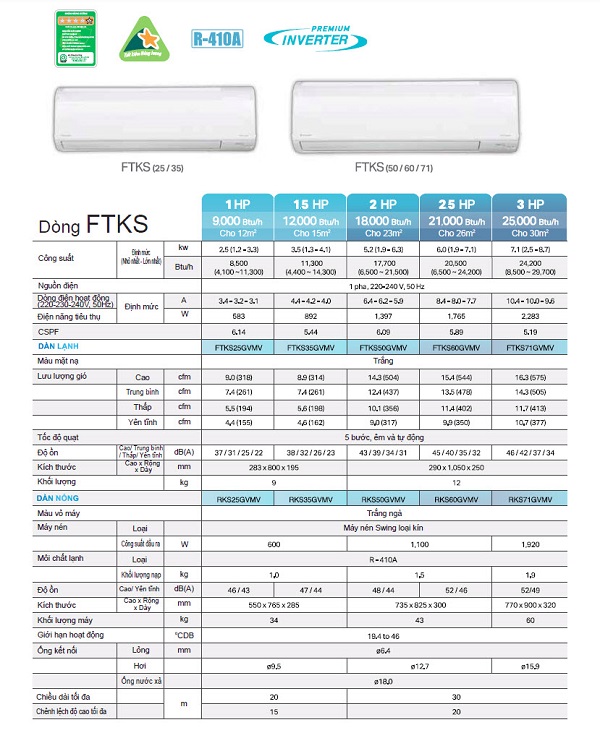 Thông số kỹ thuật dòng máy lạnh Daikin FTKS: