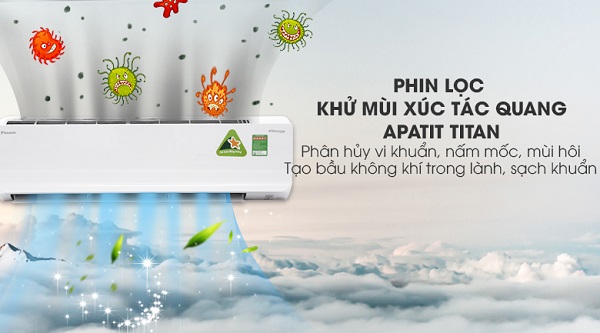 Nhờ phin lọc khử mùi xúc tác quang Apatit Titan, máy lạnh sẽ loại bỏ được vi khuẩn, bụi bẩn và các tác nhân gây dị ứng (phấn hoa, lông vật nuôi,...) có trong không khím trả lại không gian trong lành cho bạn và người thân.