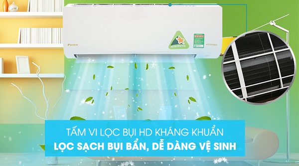 Tấm lọc vi bụi được trang bị trên máy lạnh Daikin Inverter có tác dụng lọc sạch vi khuẩn và bụi bẩn tồn tại trong không khí. Nhờ tấm lọc bụi chất liệu cao cấp này, không khí trong phòng sẽ luôn đảm bảo trong lành, mang đến cảm giác thoải mái và bảo vệ sức khỏe cho các thành viên trong gia đình.