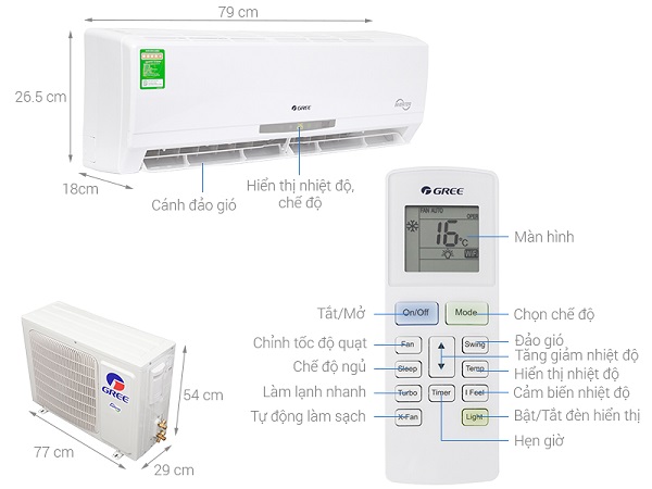 Thông tin cục nóng:Dài 77 cm - Cao 54 cm - Dày 29 cm - Nặng 26 kg