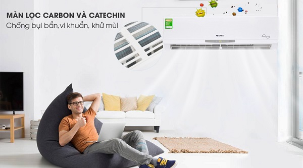 Chiếc máy lạnh Gree này còn được trang bị tấm lọc bảo vệ sức khỏe, gồm màng lọc bụi thô bên ngoài và 2 tấm lọc chức năng trà xanh diệt khuẩn và carbon khử mùi. Tạo bầu không khí trong lành, thoải mái cho người dùng.