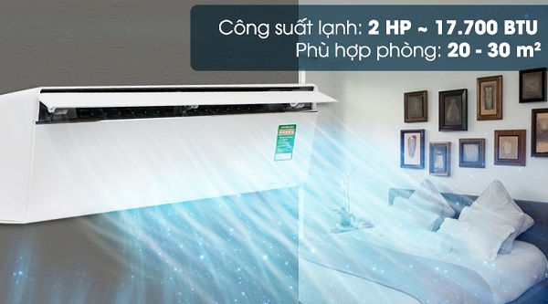Máy có công suất 2 HP thích hợp cho nhiều loại phòng ốc có diện tích khoảng từ 20 - 30 m2, chiều cao từ sàn đến trần nhà khoảng 3m.