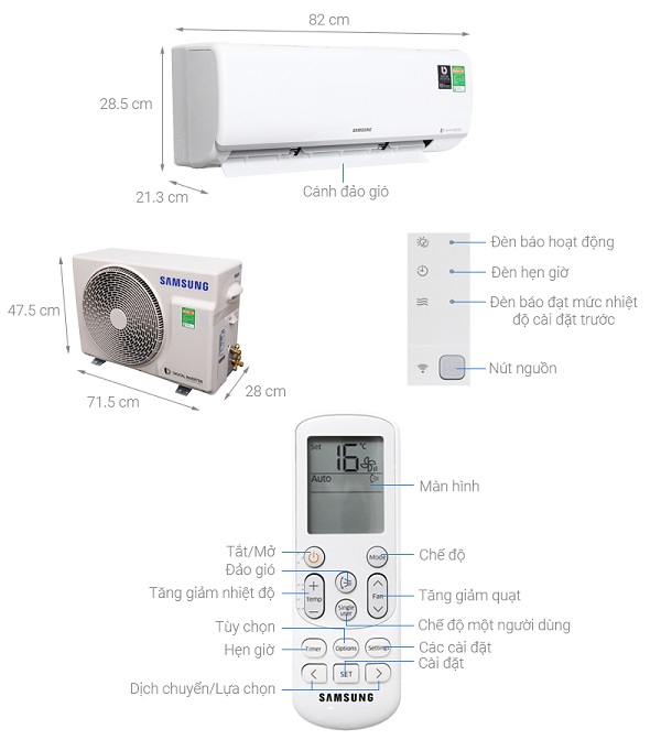 Thông tin cục lạnh:Dài 82 cm - Cao 28.5 cm - Dày 21.3 cm - Nặng 8.2 kg