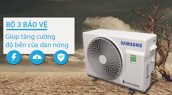 Bộ 3 bảo vệ tăng cường là một trang bị độc đáo mà Samsung dành cho máy lạnh AR10NVFTAGMNSV của mình. Nhờ vậy, máy lạnh sẽ được bảo vệ toàn diện từ: vỏ máy và dàn trao đổi nhiệt, máy nén, ổn áp. Cho máy được nâng cao tuổi thọ với thời gian.