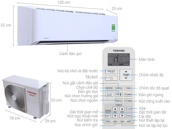Thông tin cục nóng:Dài 78 cm - Cao 55 cm - Dày 29 cm