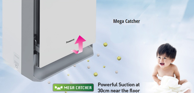 Công nghệ MEGA CATCHER giúp làm sạch bụi bẩn, các chất gây ô nhiễm ở khoảng cách 30cm so với mặt sản, là khoảng cách mà trẻ em hay chơi đùa. Trong nhà bạn, bụi có xu hướng nổi trong không khí ở khoảng cách 30cm trên sàn nhà hoặc thấp hơn. Từ dưới lên và từ cả 2 bên, tính năng Mega catcher sẽ hút mạnh mẽ các bụi này.