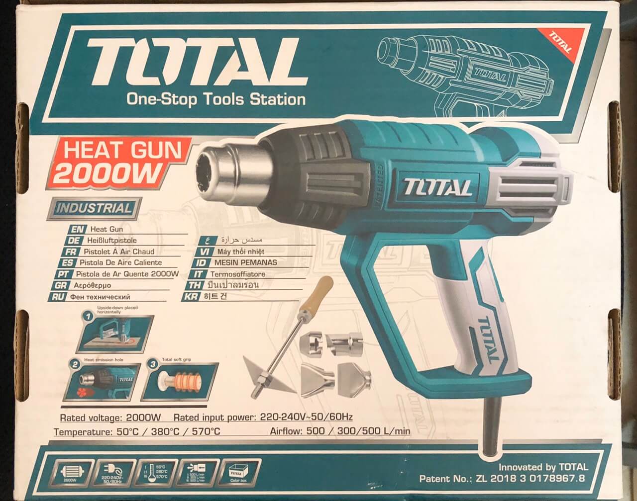 Máy thổi hơi nóng Total TB2006 có công suất 2000W với 2 mức độ thổi hơi nóng là từ 350 - 550 độ C, model này được đóng gói trọng hộp màu và có 5 phụ kiện đi kèm như hình, máy sở hữu kiểu dáng đơn giản, gọn gàng giúp cho việc cầm nắm sử dụng trở nên đơn giản và không gây mỏi tay. Sản phẩm này thường được dùng để: tháo mối hàn bằng nung chảy, làm khô sơn nước, uốn ống nhựa PVC, loại bỏ lớp sơn cũ, bọc co màn nhựa... có tính ứng dụng cao trong nhiều ngàng nghề, tuổi thọ dài lâu khi được sử dụng và bảo quản đúng cách.