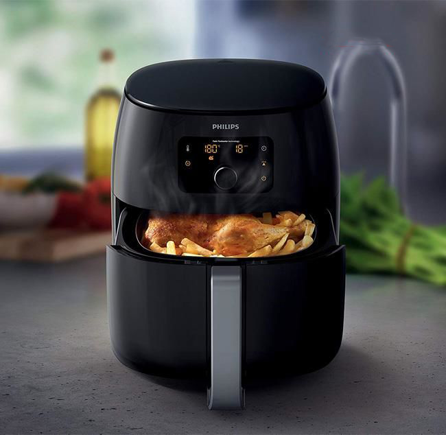 - Philips Airfryer XXL sử dụng không khí nóng mạnh để chiên thực phẩm yêu thích của bạn bằng một thìa dầu hoặc ít dầu.