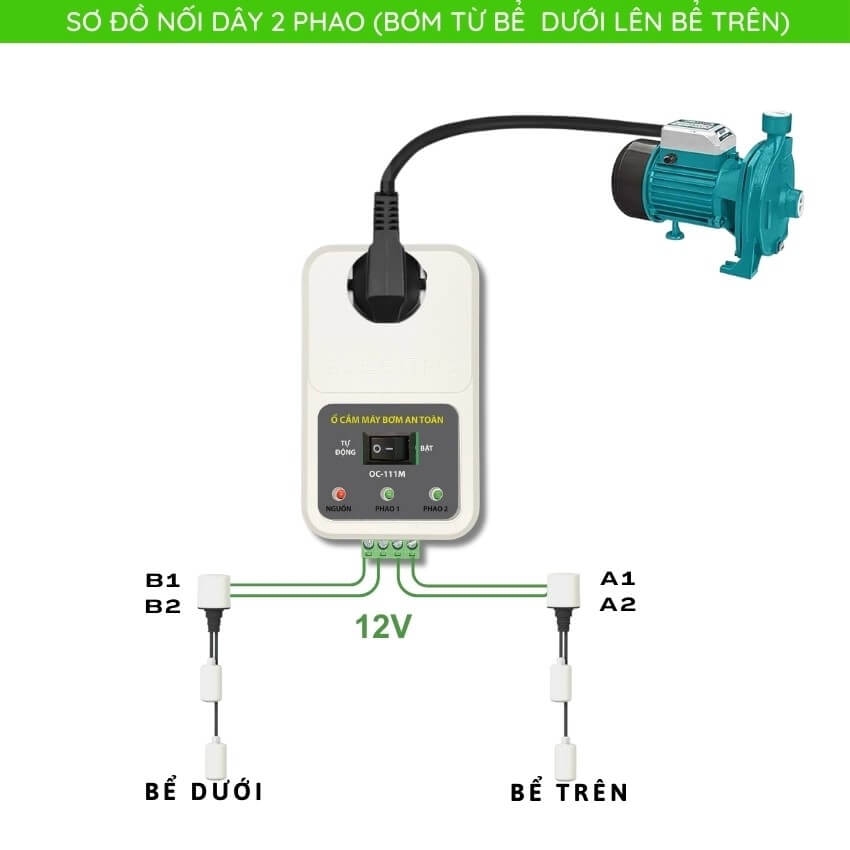 Ổ cắm máy bơm cấp nguồn điện 12V (nguồn điện cung cấp bởi biến áp cách ly) cấp đến phao điện tại các bể và điều khiển máy bơm tự động theo mức nước do các phao báo về.