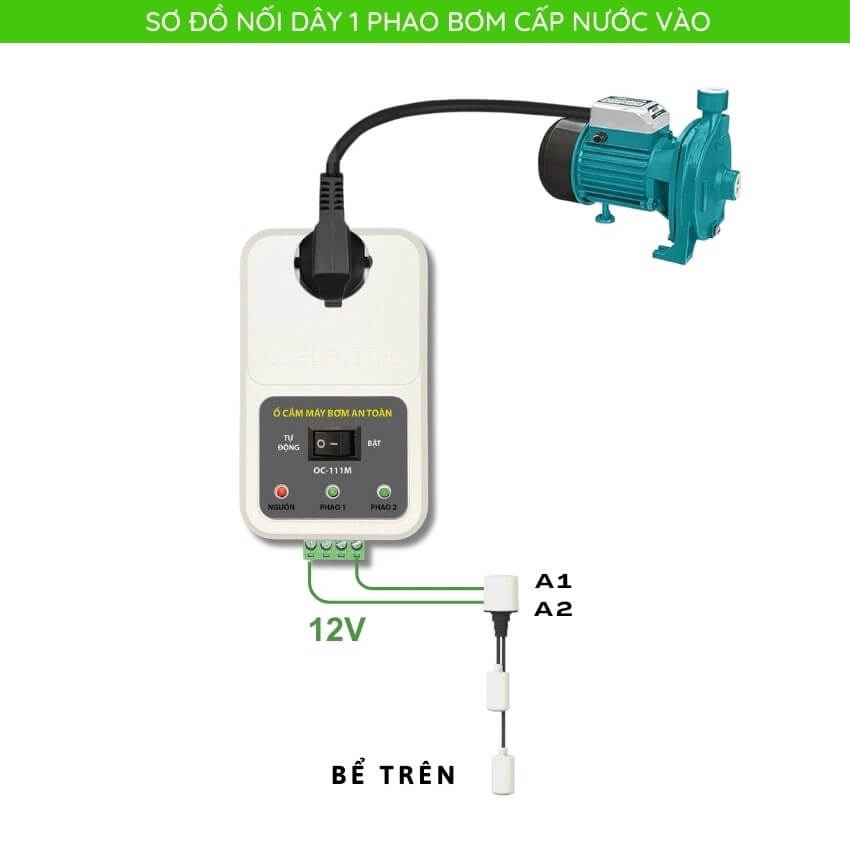 Nối dây phao vào ổ cắm (trường hợp dùng 1 phao bể trên hoặc bể ngầm) và cắm máy bơm vào lỗ cắm trên OC111M