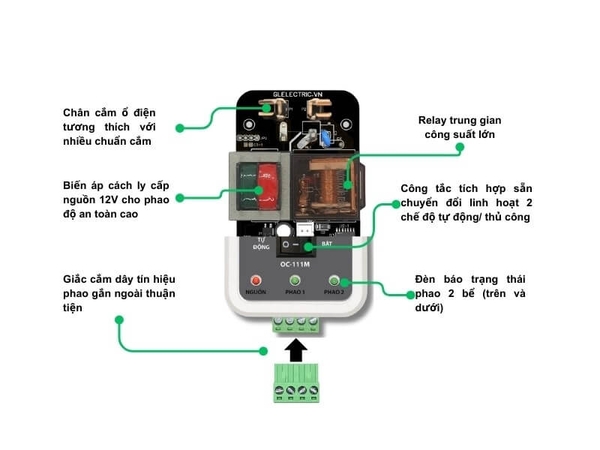 Ổ cắm máy bơm, phao điện an toàn OC-111M tương thích với phao điện tử GL2A, GL2B của GLELECTRIC và tương thích với các loại phao công tắc, phao điện kín nước trên thị trường