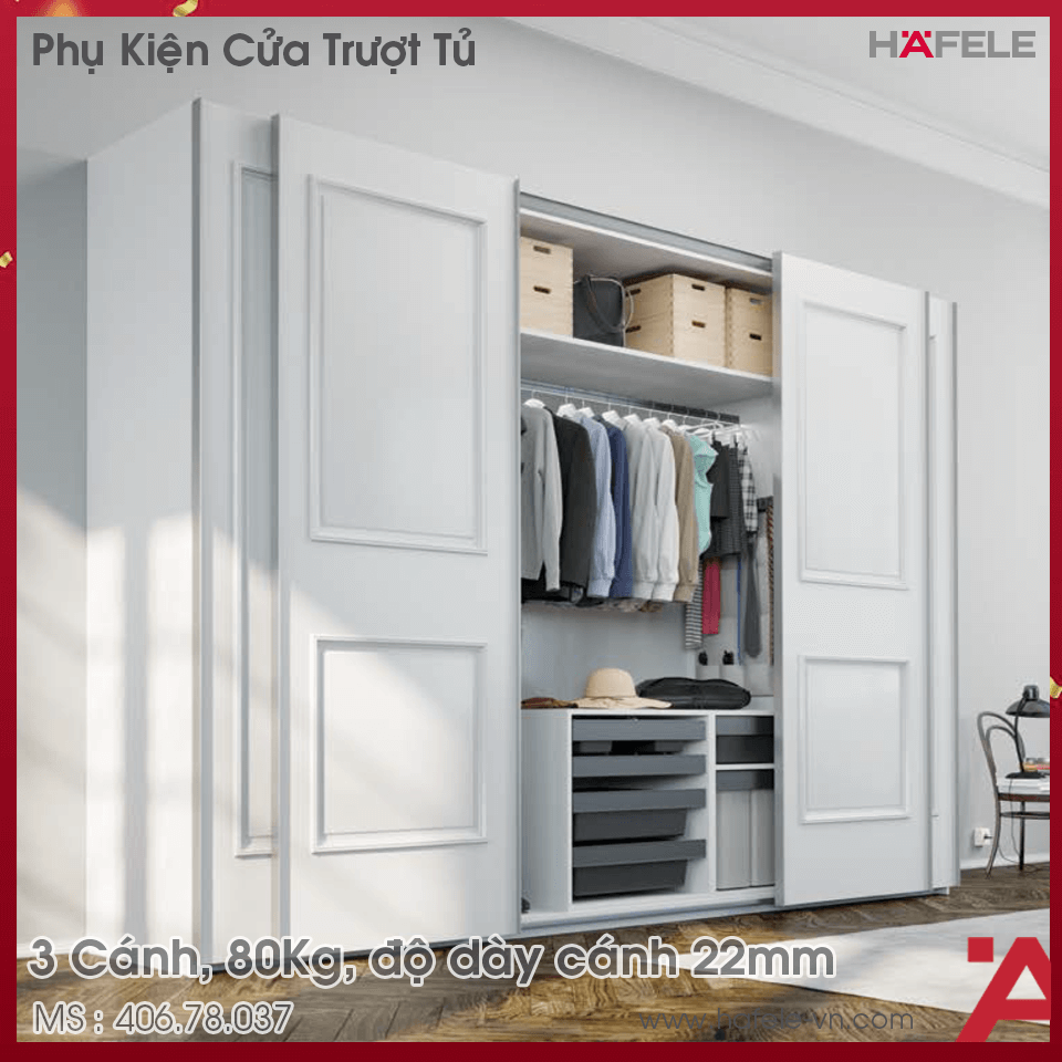 - Dành cho cửa 3 cánh, tải trọng 80Kg/cặp, độ dày cửa : 22mm