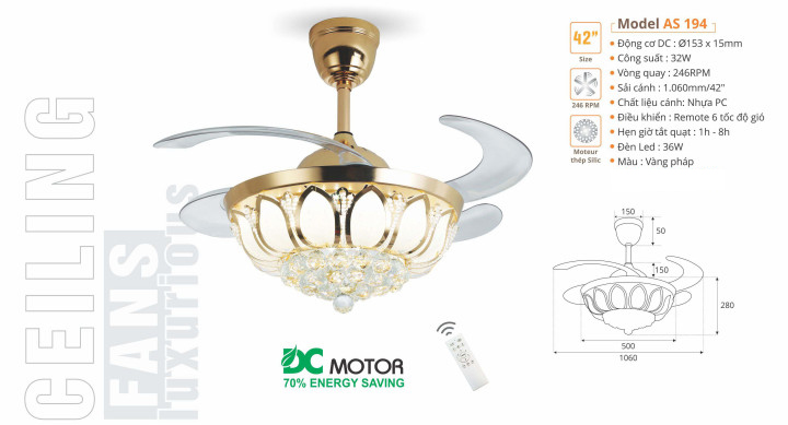 AS194 - Quạt trần cánh xếp đèn Led AS194