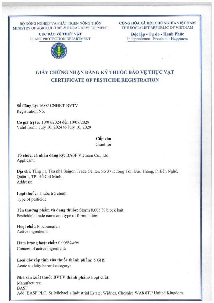 ĐẶC TÍNH ƯU VIỆT CỦA THUỐC DIỆT CHUỘT STORM: Là thuốc diệt chuột thế hệ mới do BASF - tập đoàn hóa chất hàng đầu thế giới sản xuất, Home Center VN đại lý bán hàng tại Việt Nam, STORM không cần trộn thêm mồi, diệt chuột hiệu quả cao, liều dùng cực thấp giúp tiết kiệm chi phí, và an toàn cho người, vật nuôi.